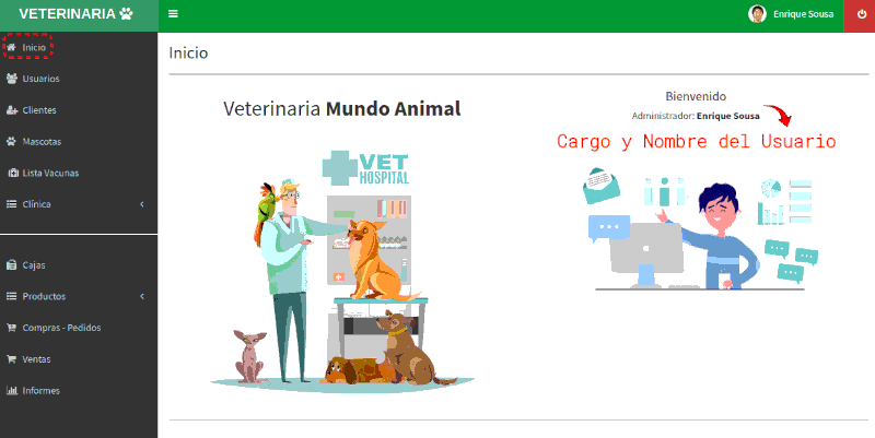 Ventana de Inicio Secci贸n Menu - Inicio Esta es la ventana de inicio del sistema, aqu铆 podemos ver el nombre de usuario y el cargo del usuario que inicio la sesi贸n. Documentaci贸n | Gestor de Veterinarias | Ventana de Inicio | TJWeb