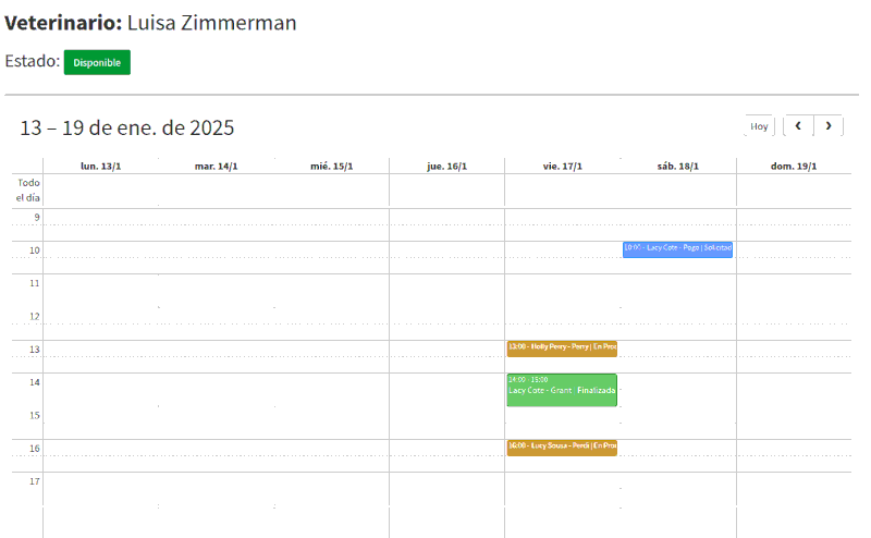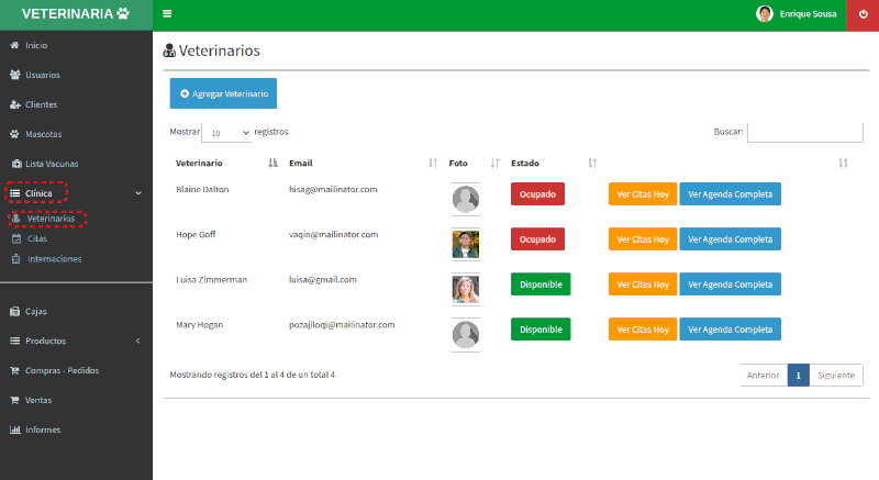 En este modulo podemos gestionar los veterinarios, le podemos colocar un estado de ocupado o disponible.