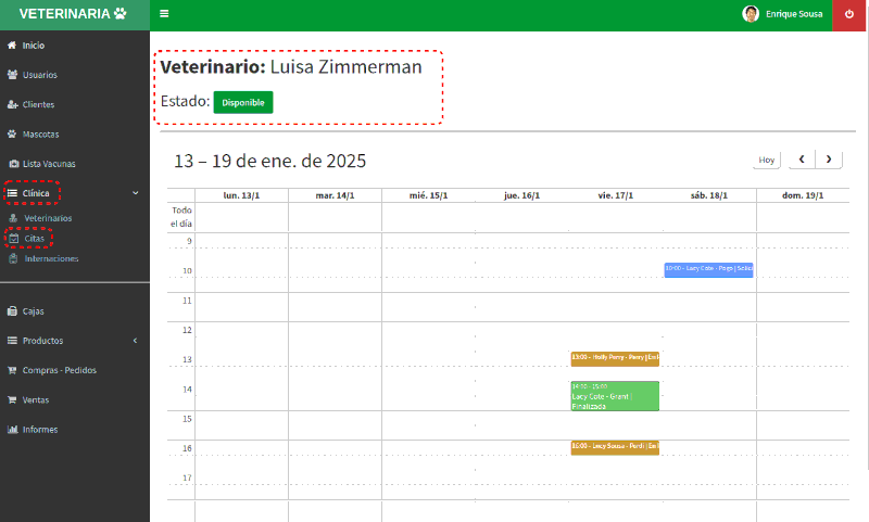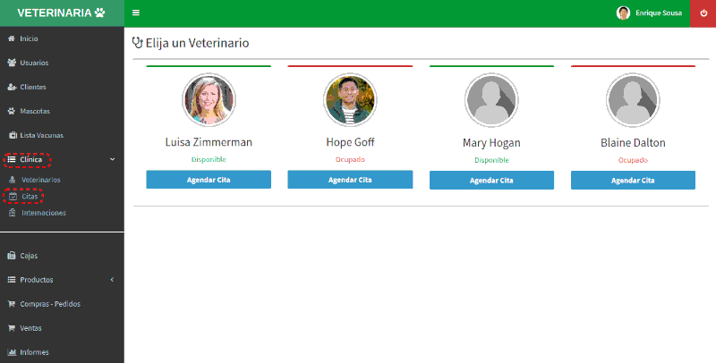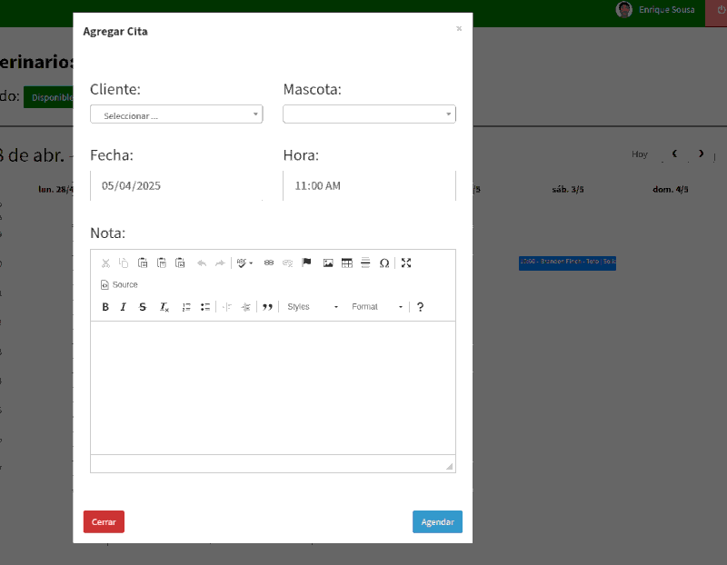 Al dar click al bot贸n de agendar cita entramos al modulo de agendar cita para el veterinario.