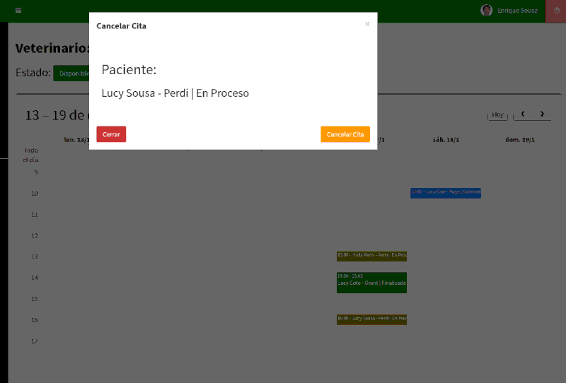 Para cancelar una cita, solo dar click en la cita que deseamos cancelar y nos aparece la siguiente ventana donde podemos confirmar si queremos realmente cancelar esta cita.