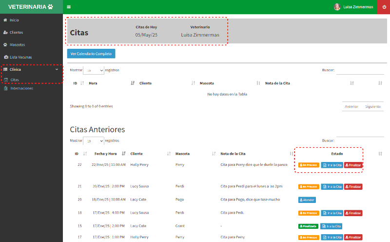 Al hacer login con clave de Veterinario, podemos gestionar las citas de la siguiente manera. Lo primero que vemos es una lista de todas las citas del veterinario, encabezando las citas del d铆a de hoy. Tambi茅n podemos ver que que citas siguen en proceso y no han terminado.