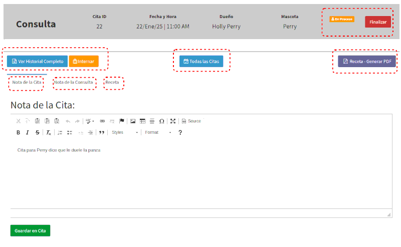 Al ir a la cita, aqu铆 podemos editar y manipular varios aspectos de la cita.